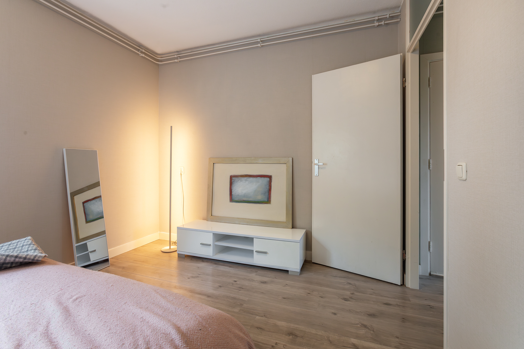 De ruime slaapkamer ligt aan de rustige voorzijde van de woning en heeft een walk-in-closet.
