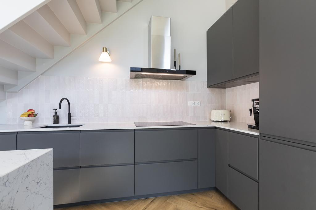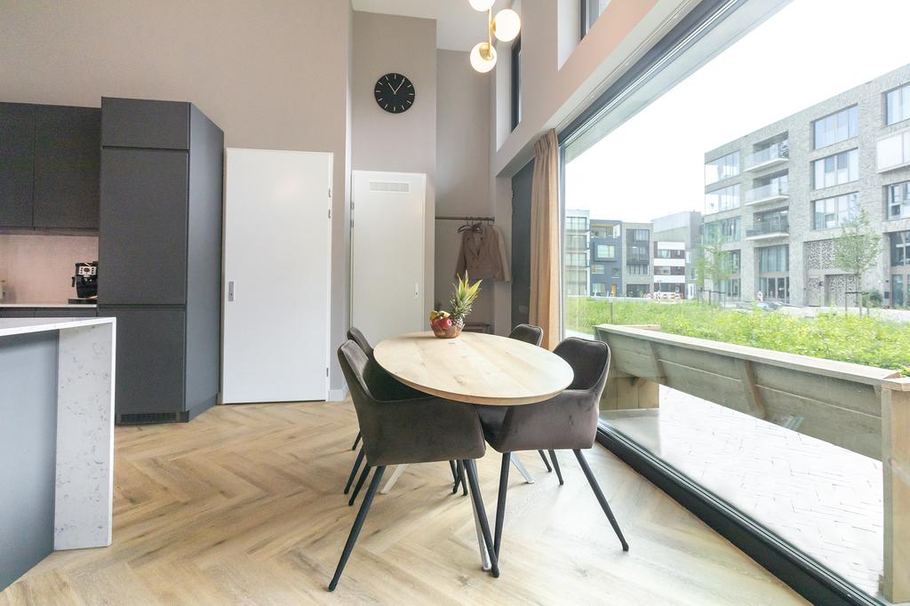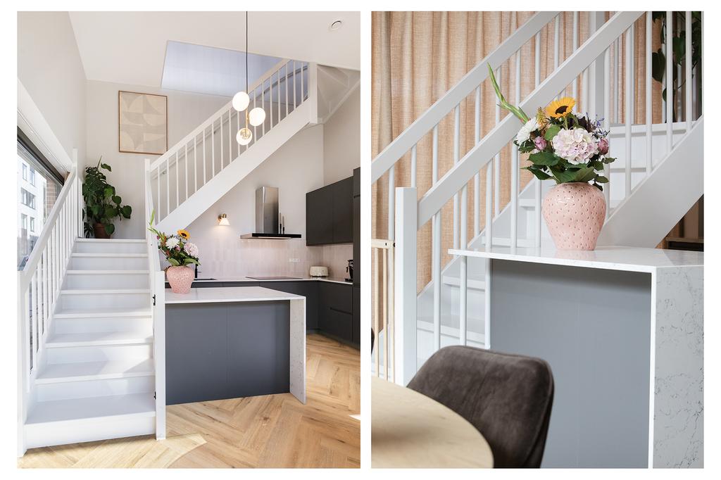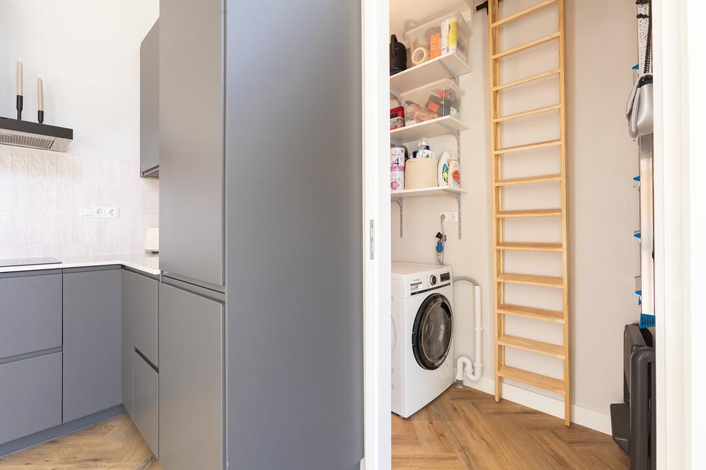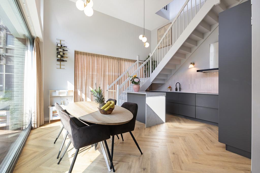 The apartment is located on the ground floor and first floor of a luxury complex with a lift that provides access to the parking garage and bicycle storage. Through the private entrance, you enter the delightful living kitchen with a 4-meter-high ceiling and have access to the pantry, which extends over two floors, with a washing machine connection downstairs and an additional created storage attic above. The spacious kitchen is equipped with built-in appliances such as a refrigerator, oven, dishwasher, stove, and a Quooker. The large drawers and cabinets under the countertop provide ample storage space.