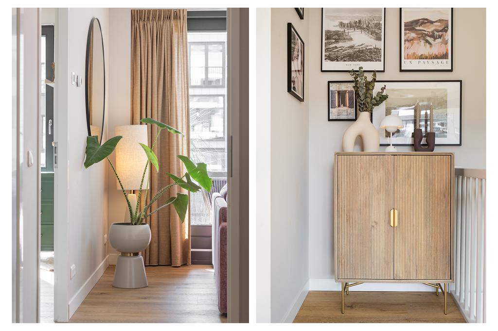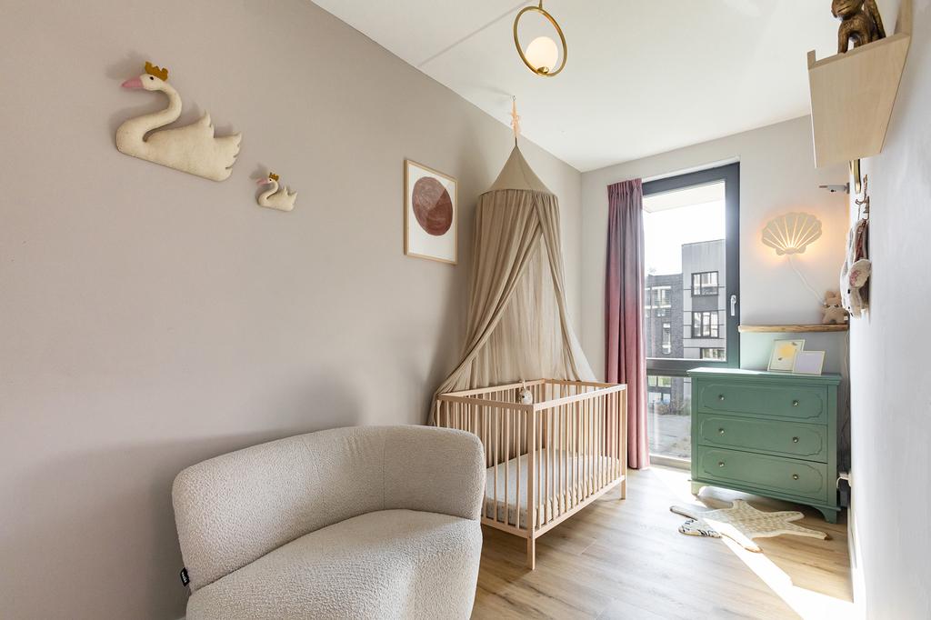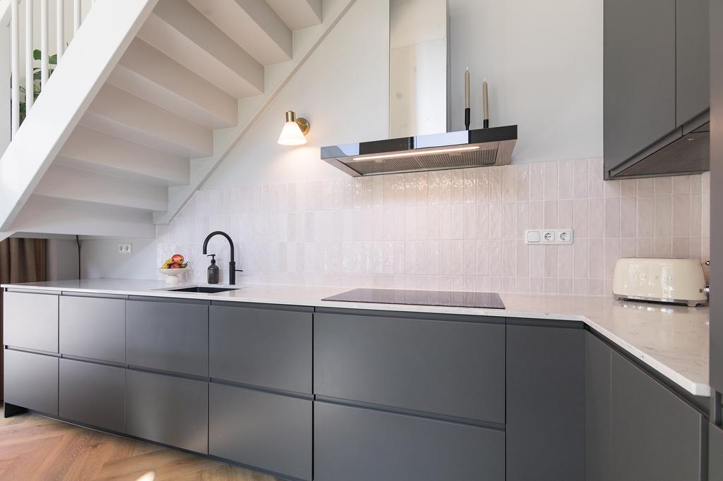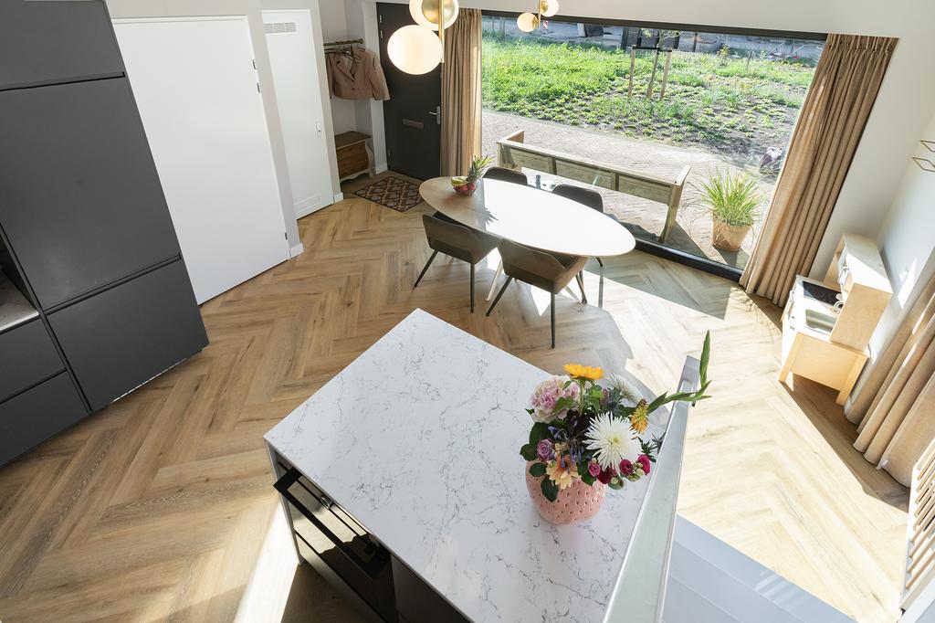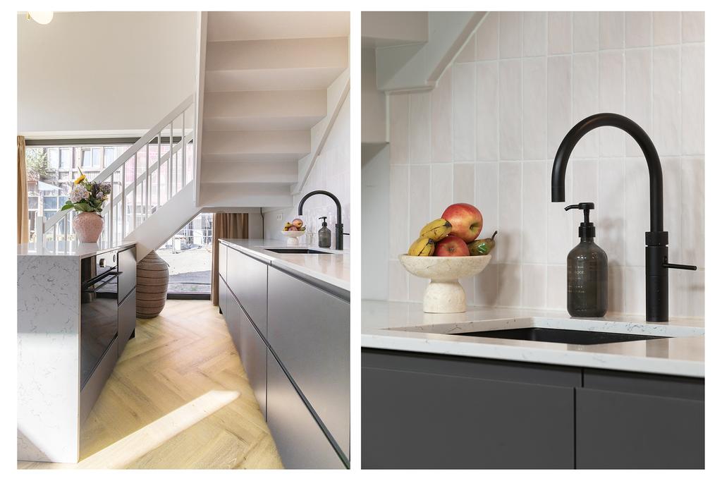The apartment is located on the ground floor and first floor of a luxury complex with a lift that provides access to the parking garage and bicycle storage. Through the private entrance, you enter the delightful living kitchen with a 4-meter-high ceiling and have access to the pantry, which extends over two floors, with a washing machine connection downstairs and an additional created storage attic above. The spacious kitchen is equipped with built-in appliances such as a refrigerator, oven, dishwasher, stove, and a Quooker. The large drawers and cabinets under the countertop provide ample storage space.