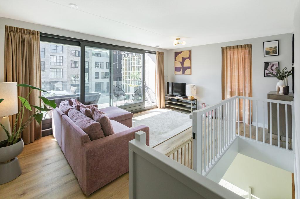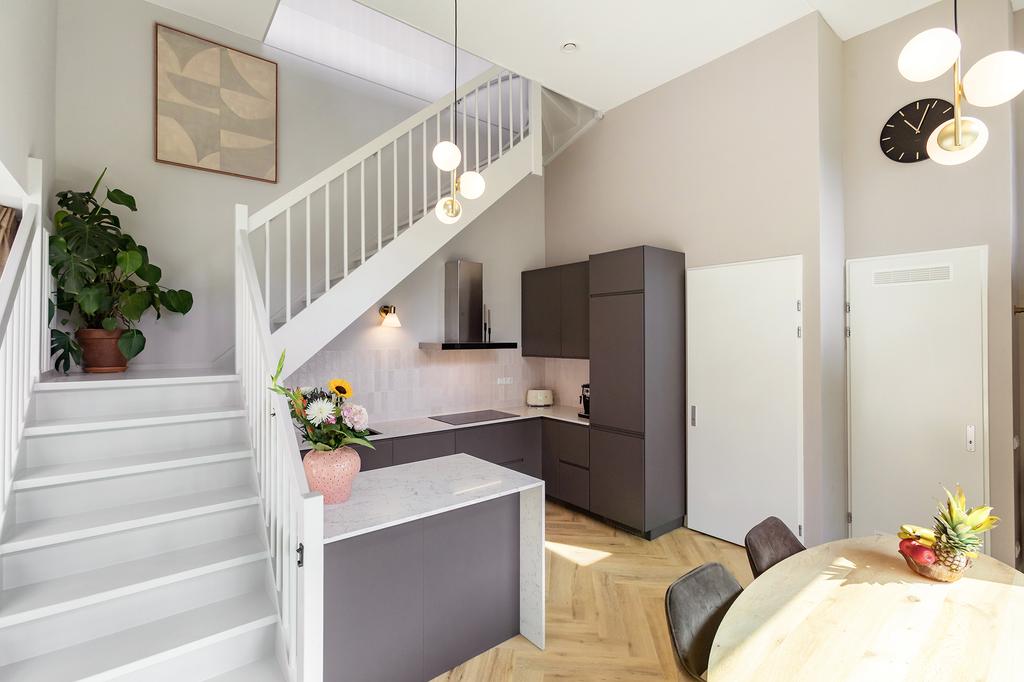 Het appartement ligt op de begane grond en de eerste etage van een luxe complex met een lift die toegang biedt tot de parkeergarage en fietsenstalling. Via de eigen entree loop je de heerlijke leef-keuken binnen, met een 4 meter hoog plafond, en heb je toegang tot de pantry, die zich over twee verdiepingen uitstrekt, met een wasmachineaansluiting beneden en een extra gecreëerde bergzolder boven. De royale keuken is voorzien van inbouwapparatuur, zoals een koelkast, oven, vaatwasser, kookplaat en een Quooker. De ruime lades en kastjes onder het aanrecht bieden voldoende opbergruimte.