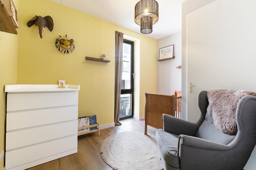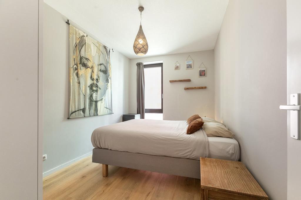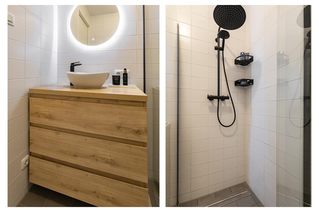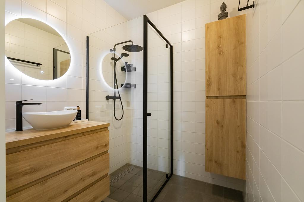 There are 3 bedrooms. All bedrooms have the same beautiful PVC flooring as the herringbone floor downstairs, but on the upper floor, it is laid in planks. The sleek, spacious bathroom has a walk-in shower and a light vanity unit.