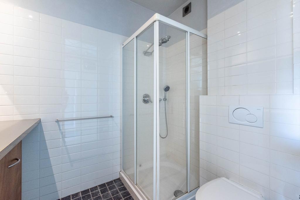 De badkamer is modern afgewerkt en heeft een douche, wastafelmeubel en een toilet.