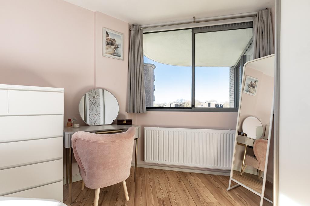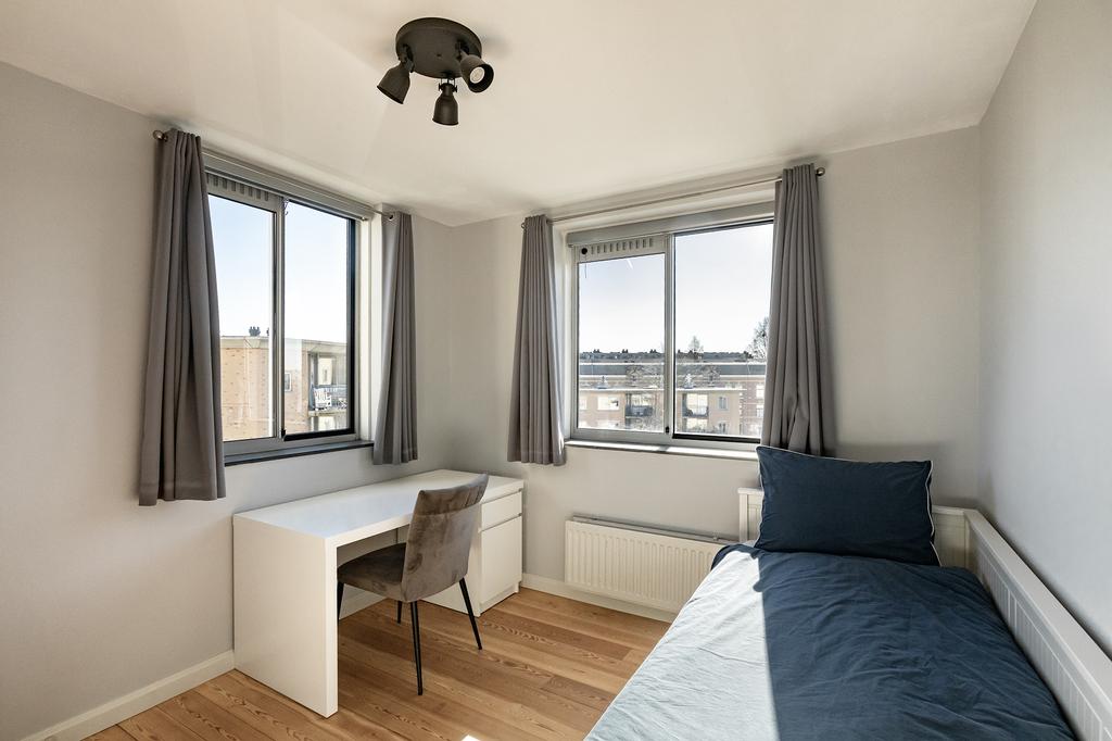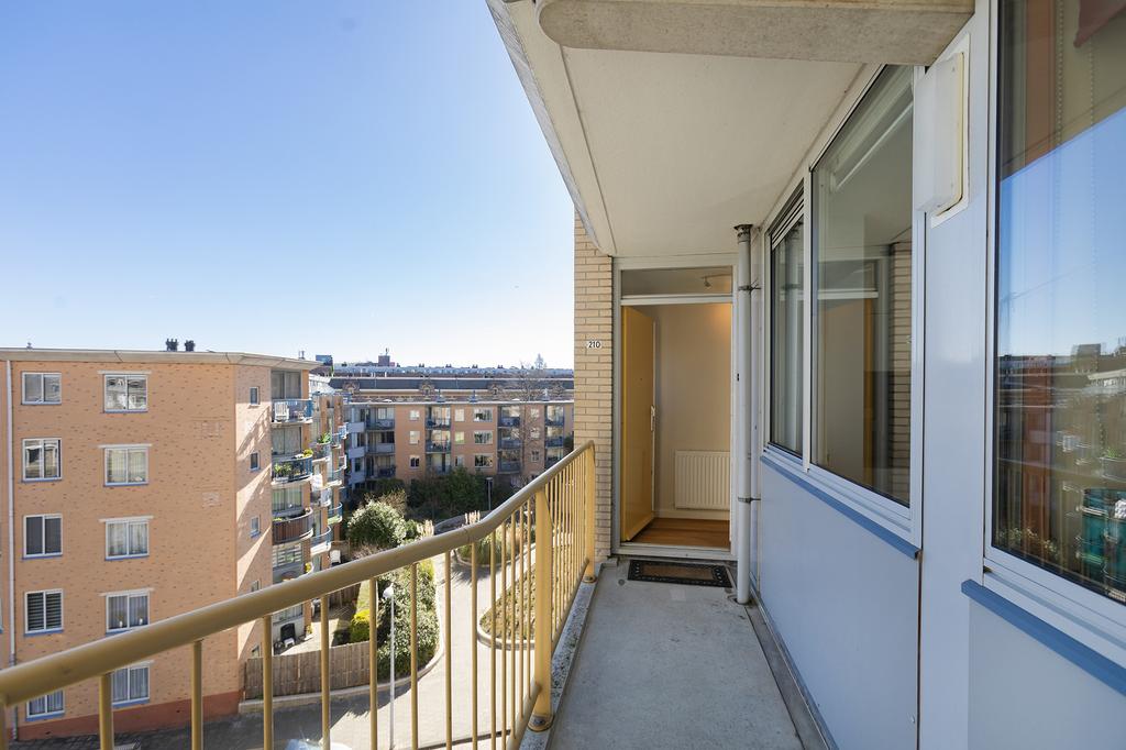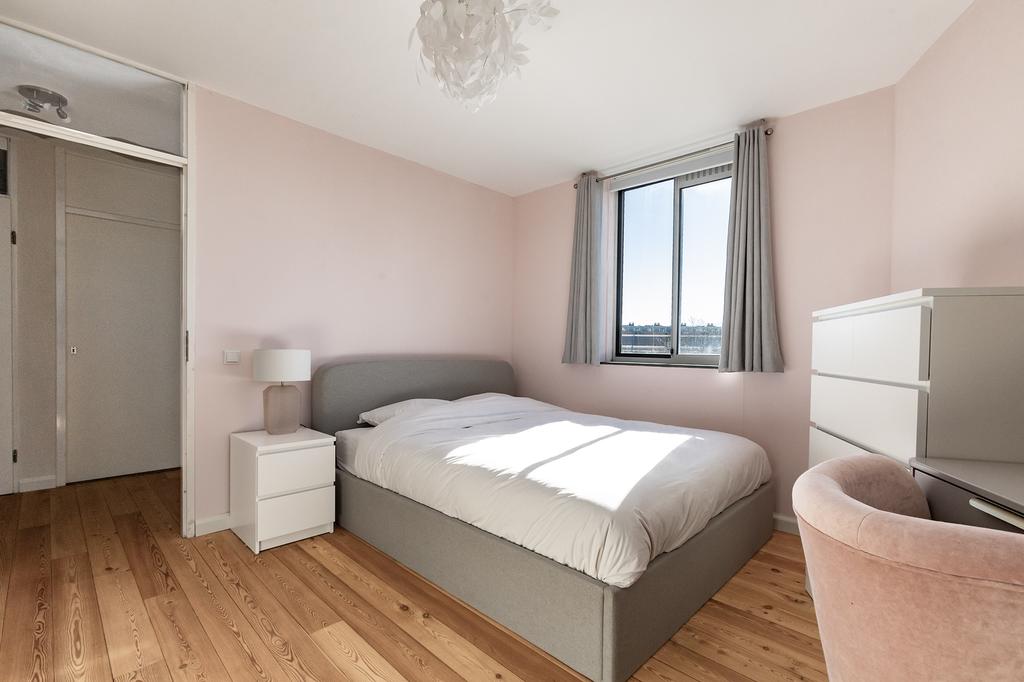 Het appartement beschikt over twee ruime slaapkamers. De grootste slaapkamer biedt uitzicht over het zonnige balkon. De tweede slaapkamer is ideaal als werkruimte, kinderkamer of logeerkamer. In de handige berging bevindt zich de wasmachine-/drogeraansluiting en de CV installatie. Via de hal is het separate toilet bereikbaar