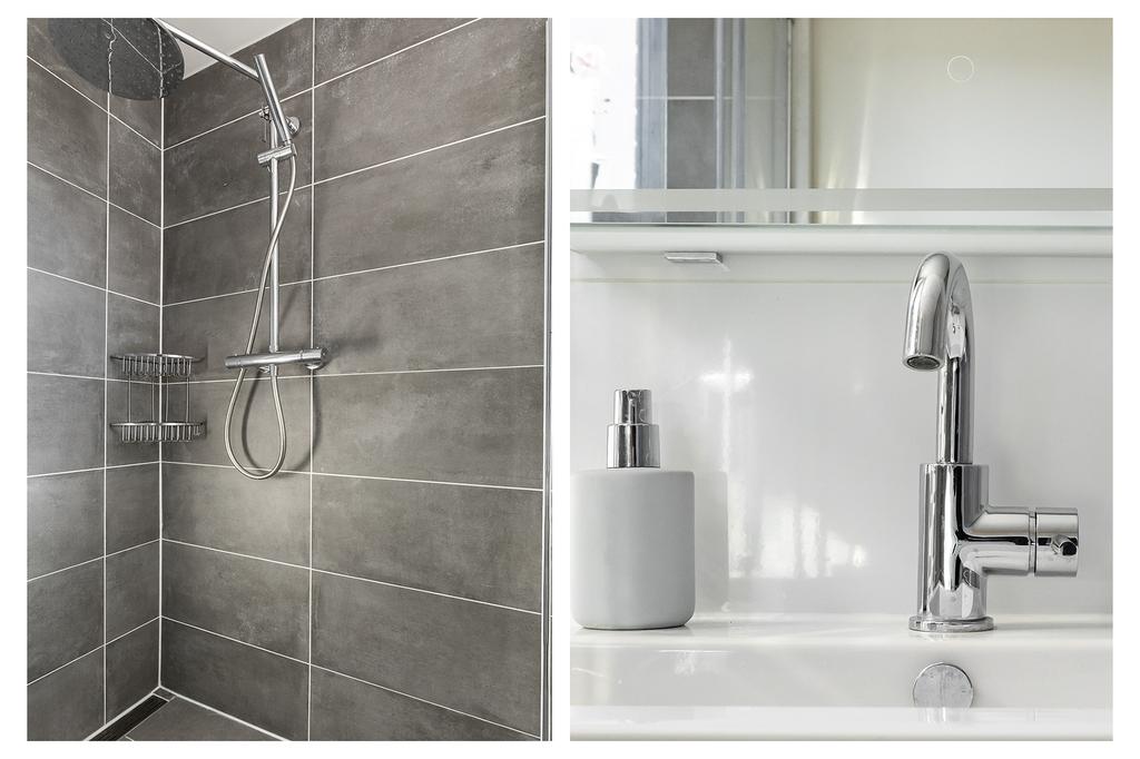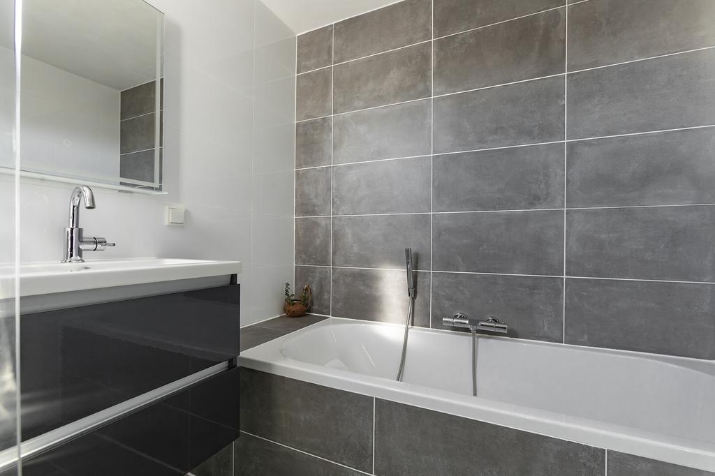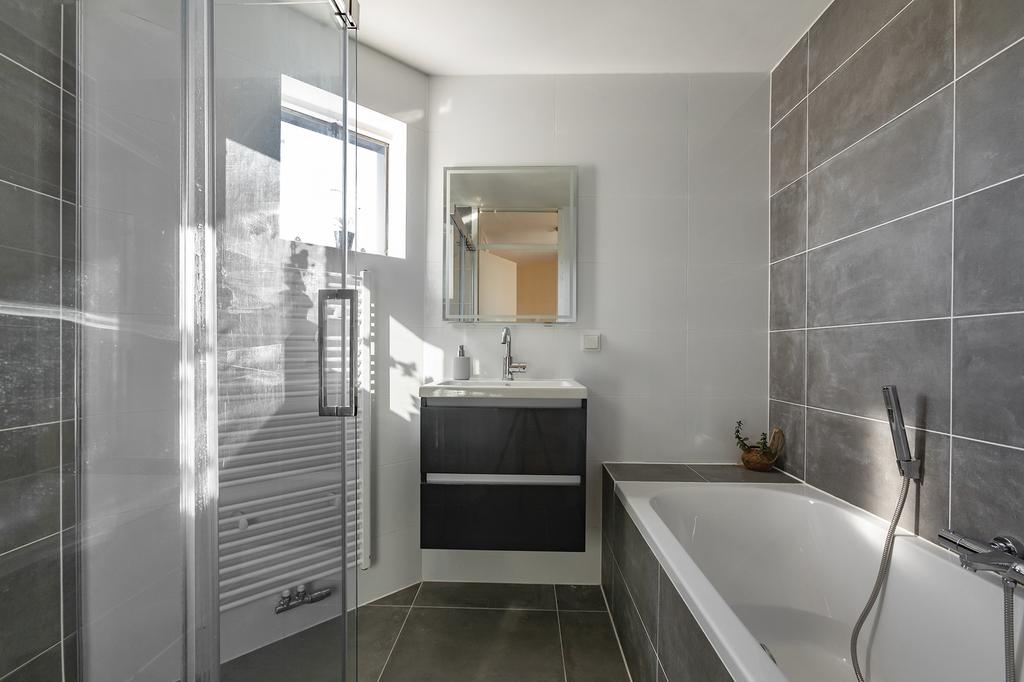 De badkamer is in 2021 gerenoveerd en voorzien van een ligbad en aparte douche, een wastafel met opbergruimte en aansluitingen voor elektra.