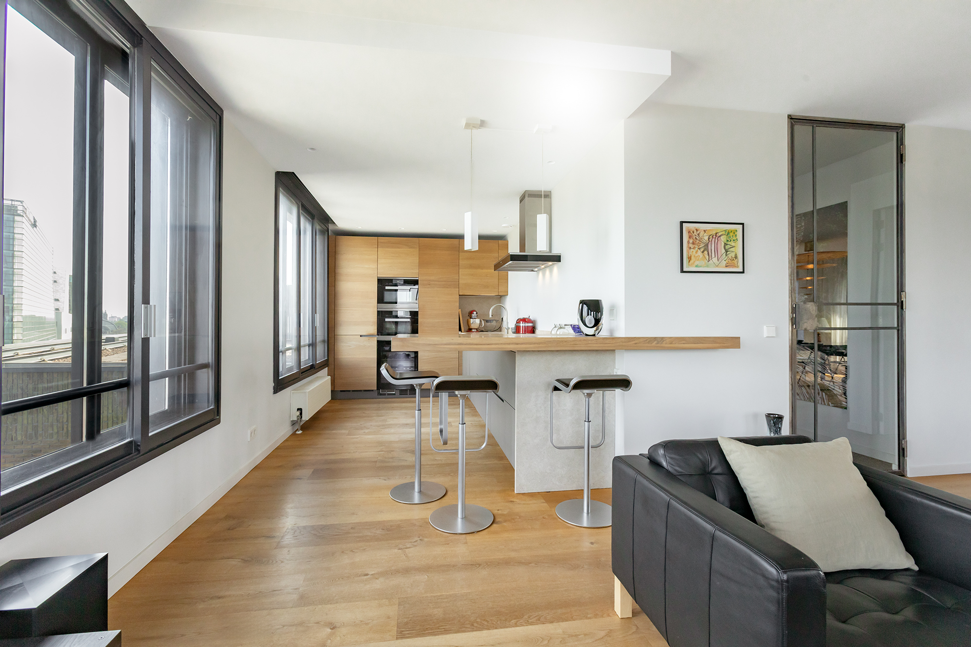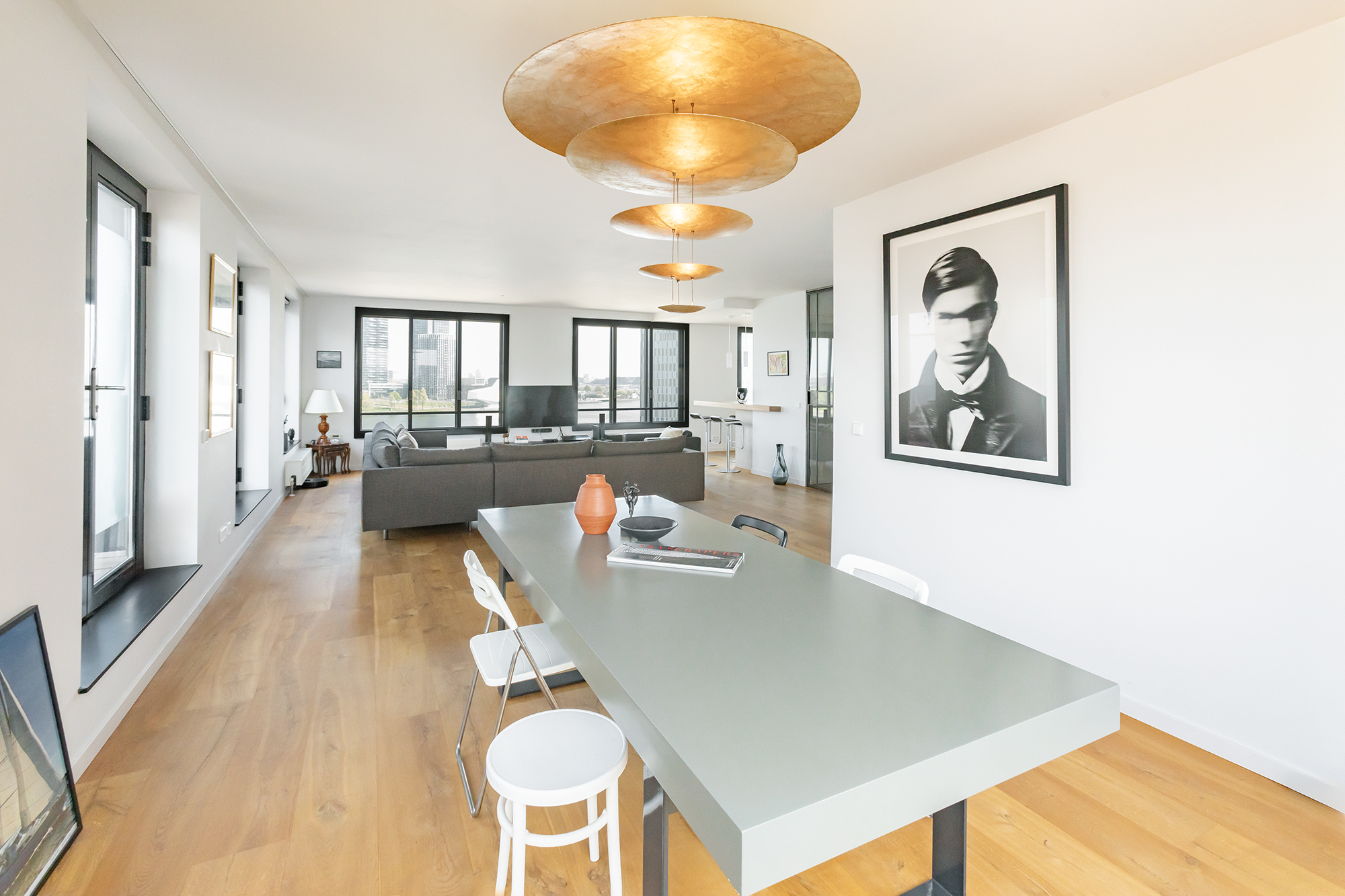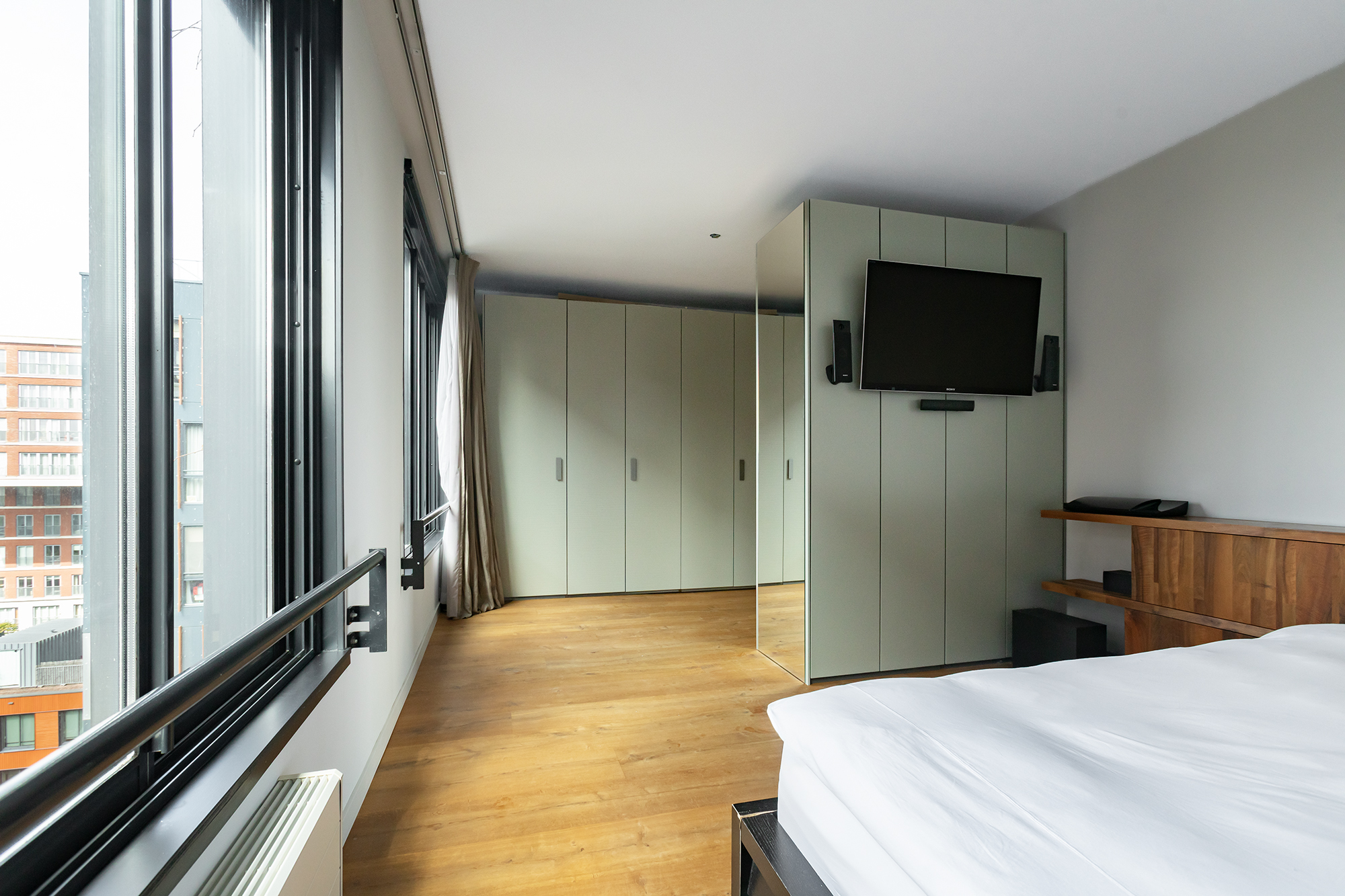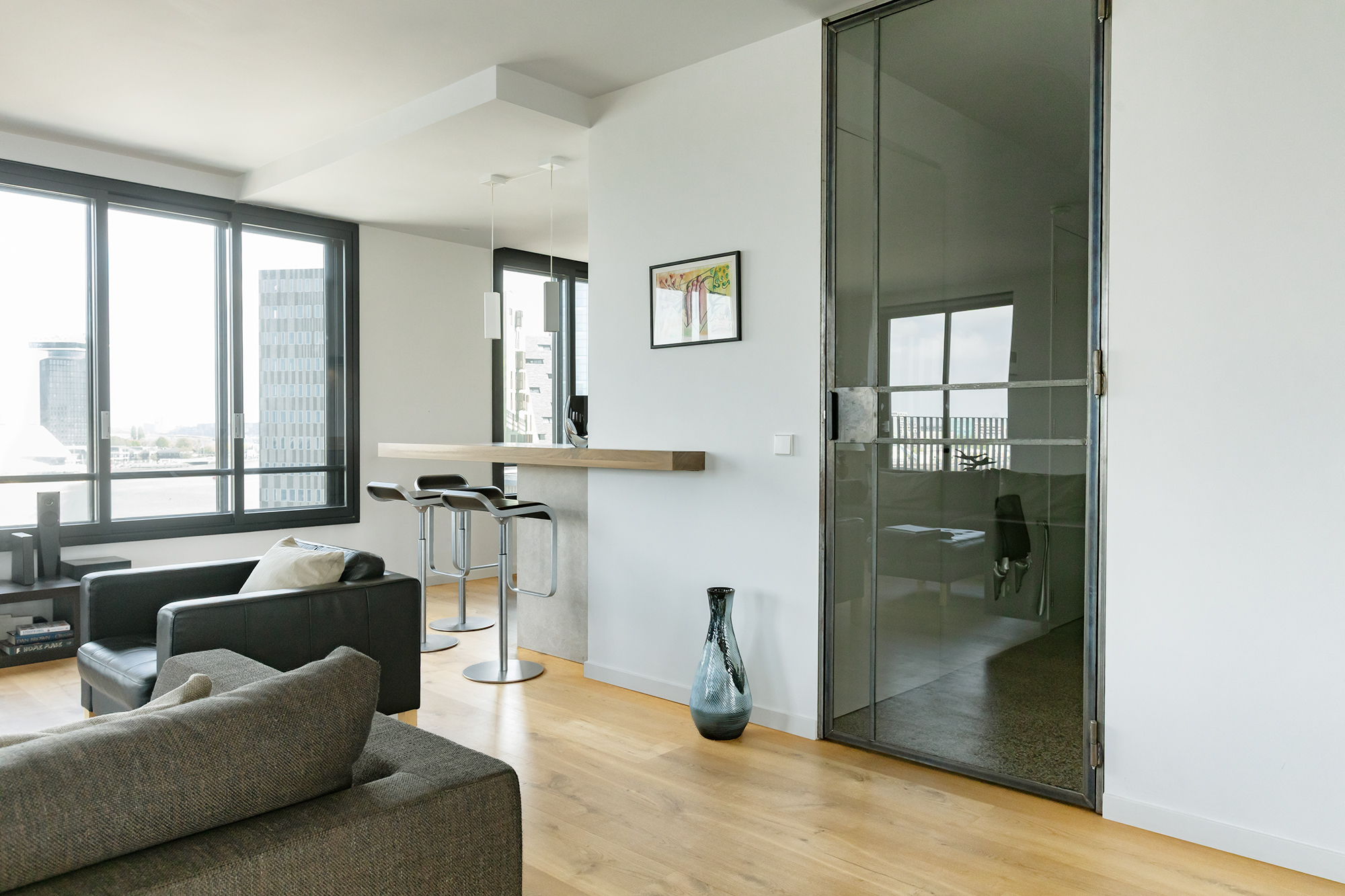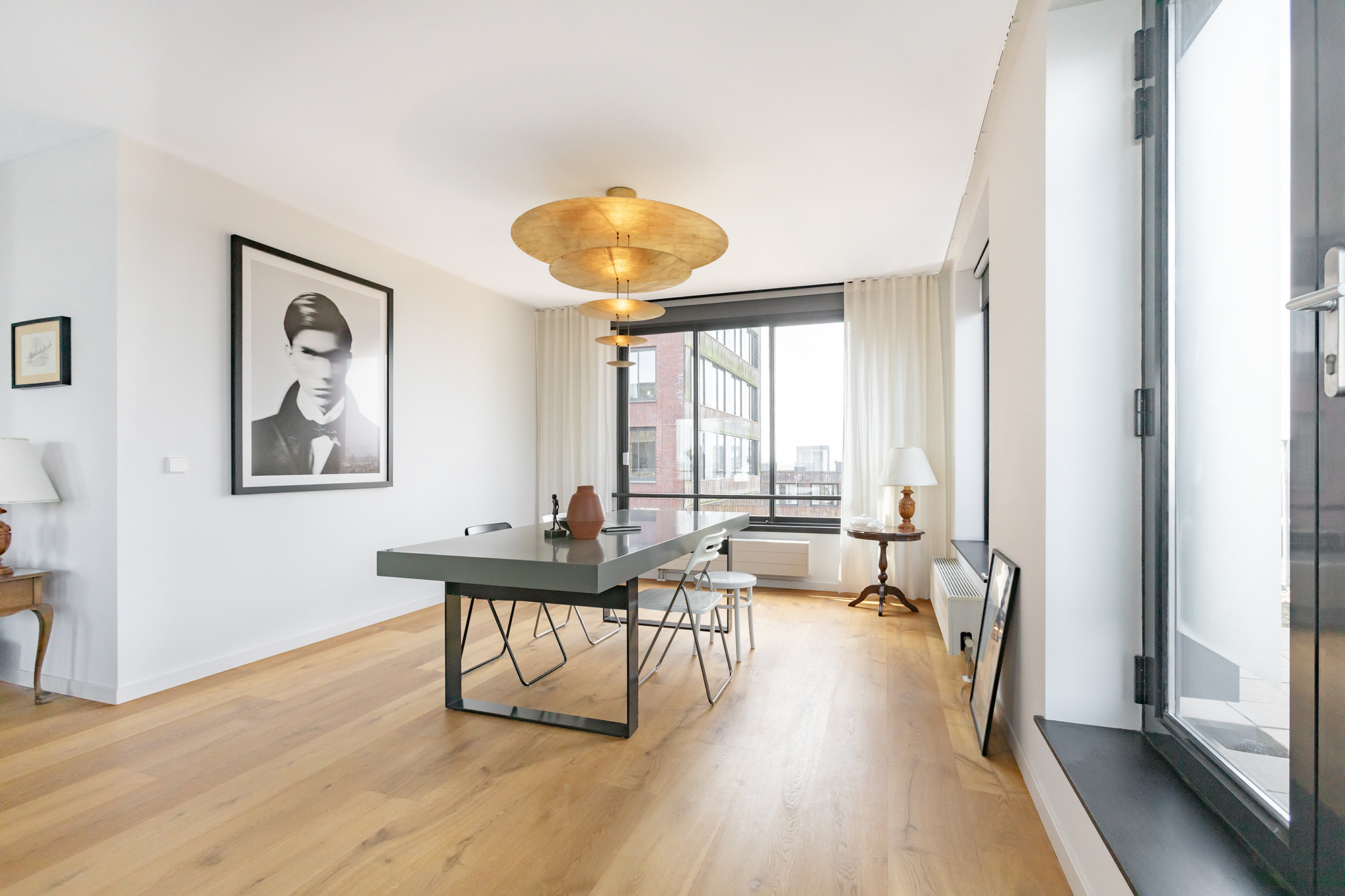 The living area is spacious and open, with meticulous attention to detail: a custom-made steel and glass door, recessed lighting, elegant French oak flooring, and ambient light throughout. The living room seamlessly flows into the kitchen and dining area, creating the feel of a sophisticated loft – with the Amsterdam skyline as your backdrop.