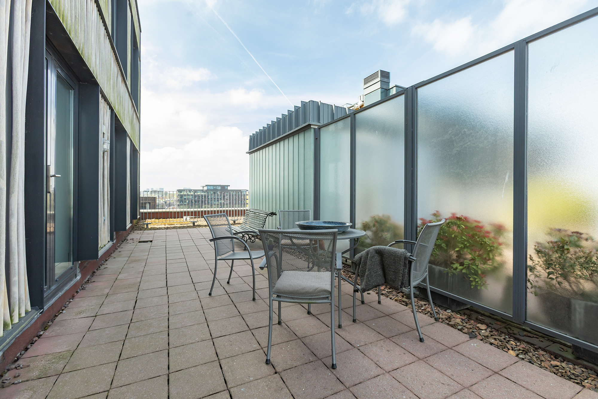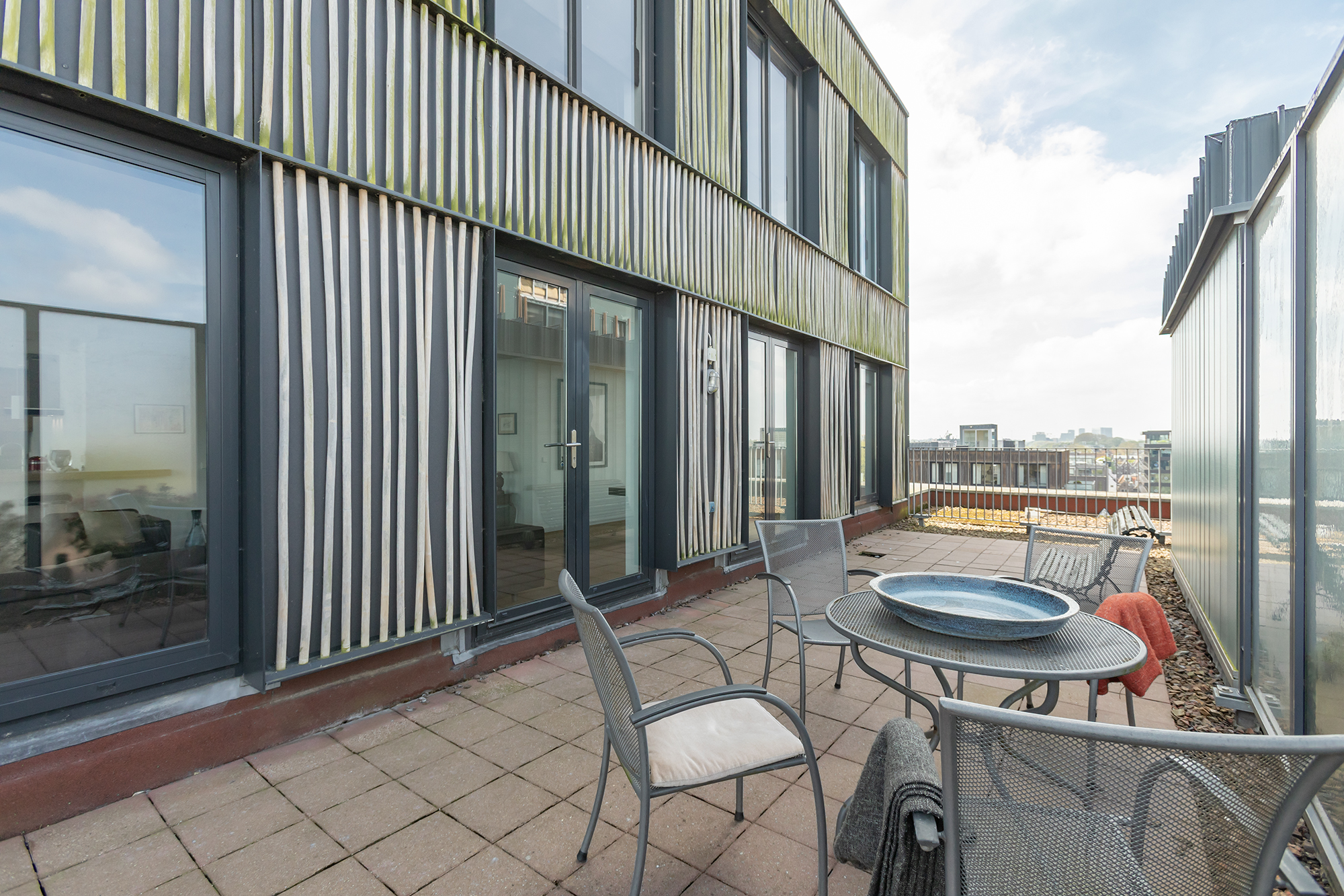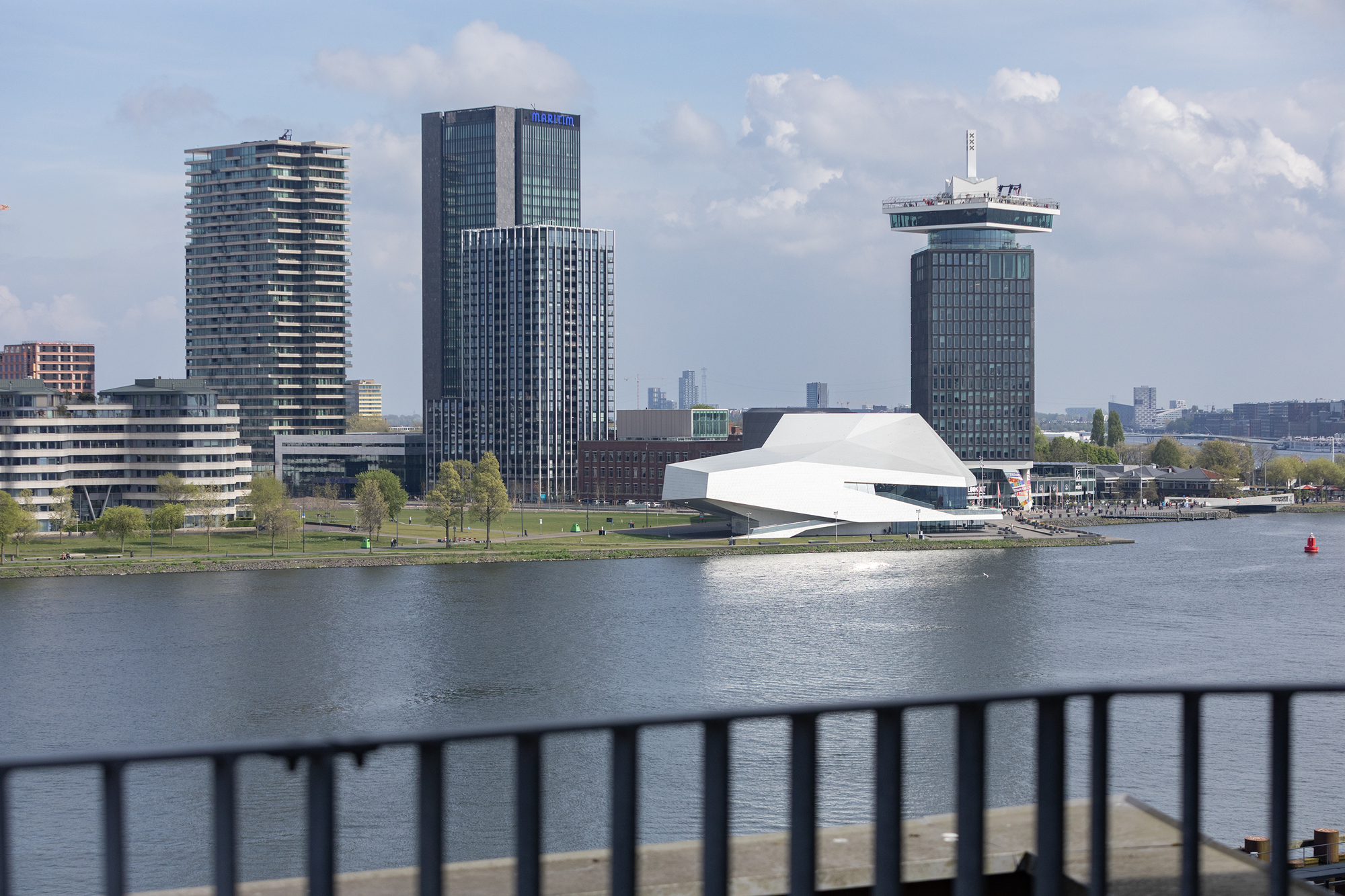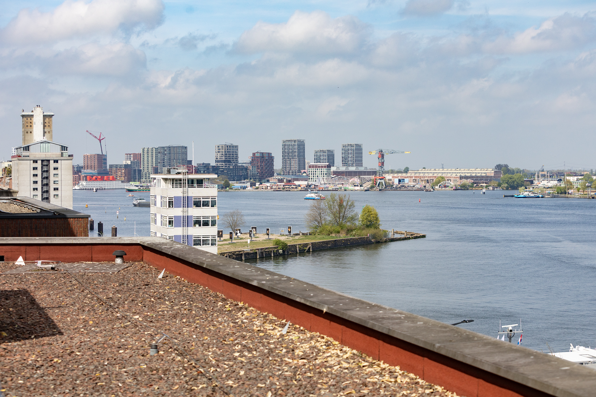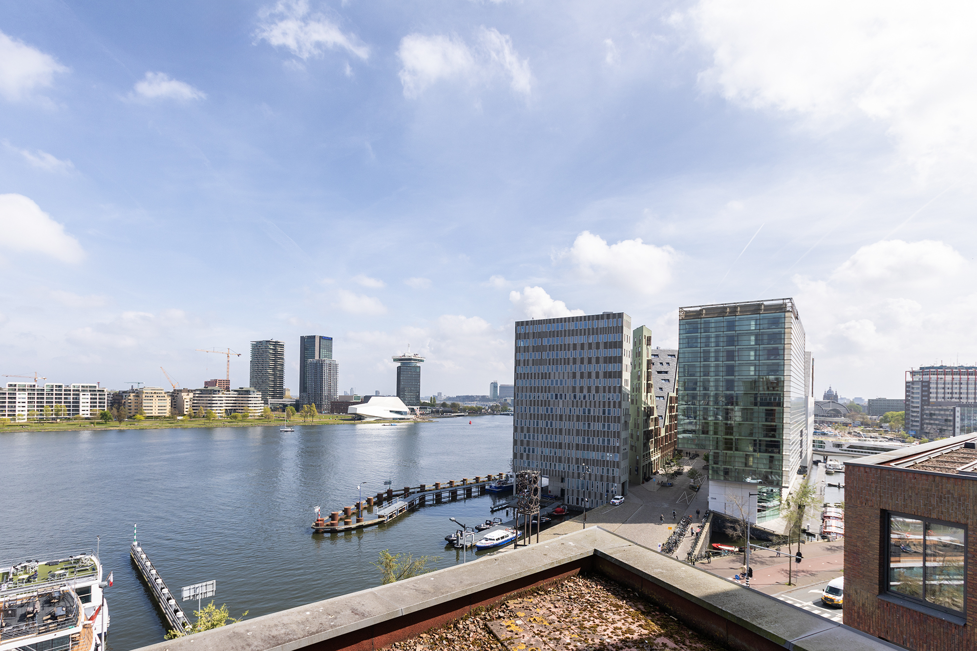 Het uitzicht is werkelijk uniek – over het IJ, het Westerdok, de A’DAM Toren, het NDSM-terrein en Prinseneiland. Ook in de avond is het hier magisch met de lichtjes van de stad. Het balkon is voorzien van elektra.