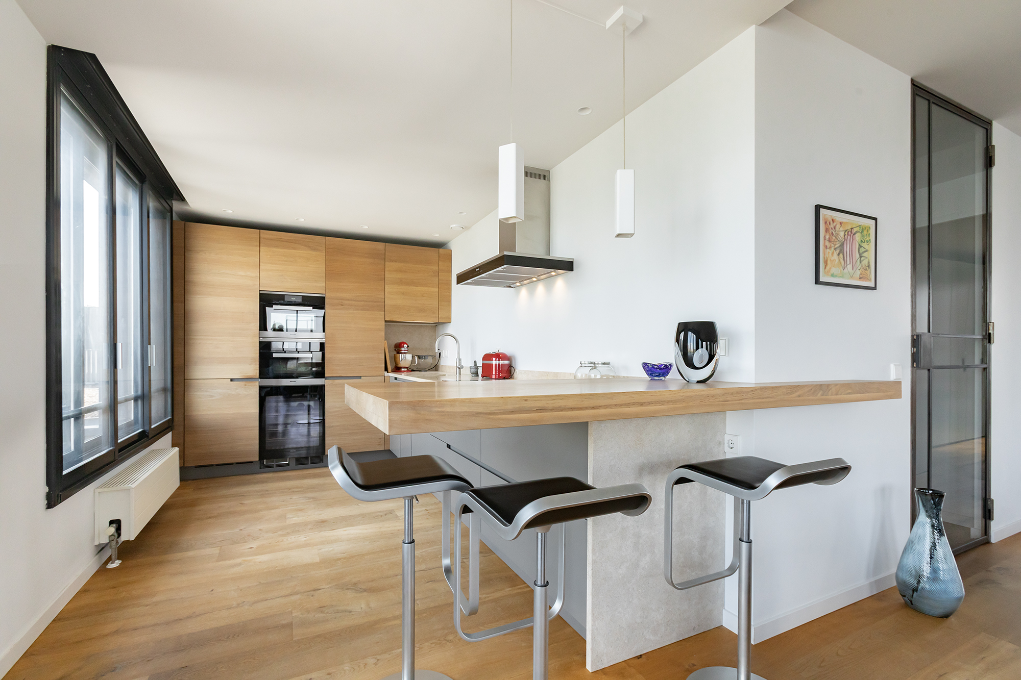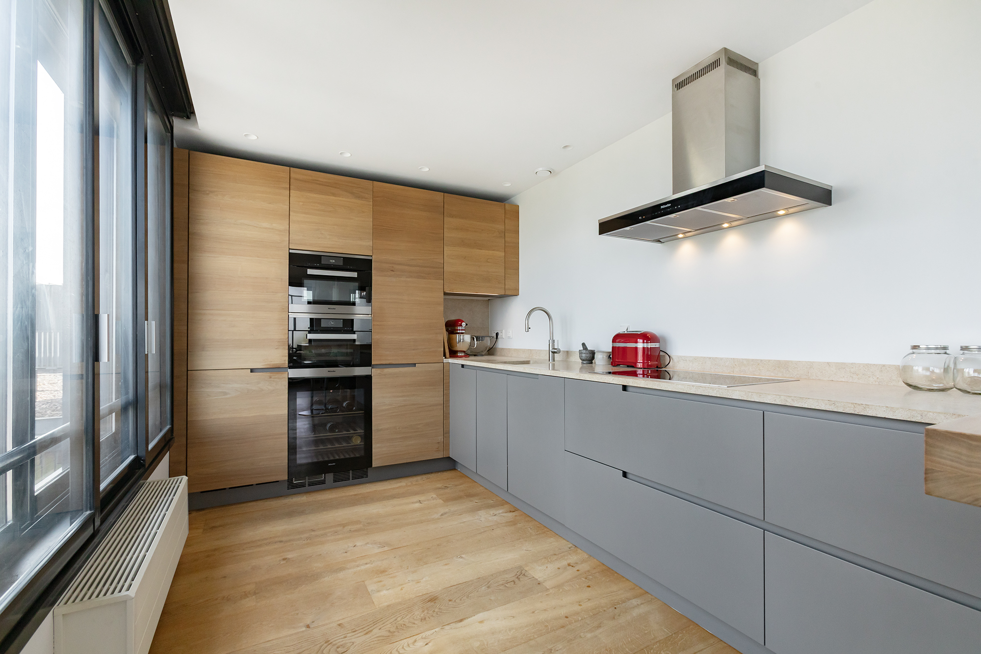 De keuken is een droom voor kookliefhebbers: strak vormgegeven, praktisch ingedeeld en voorzien van topkwaliteit Miele apparatuur, inclusief een wijnklimaatkast. Een bijzonder element is de eetbar, perfect om tijdens het koken te borrelen, mee te praten of gezellig te ontbijten. Het is de ideale plek in huis.