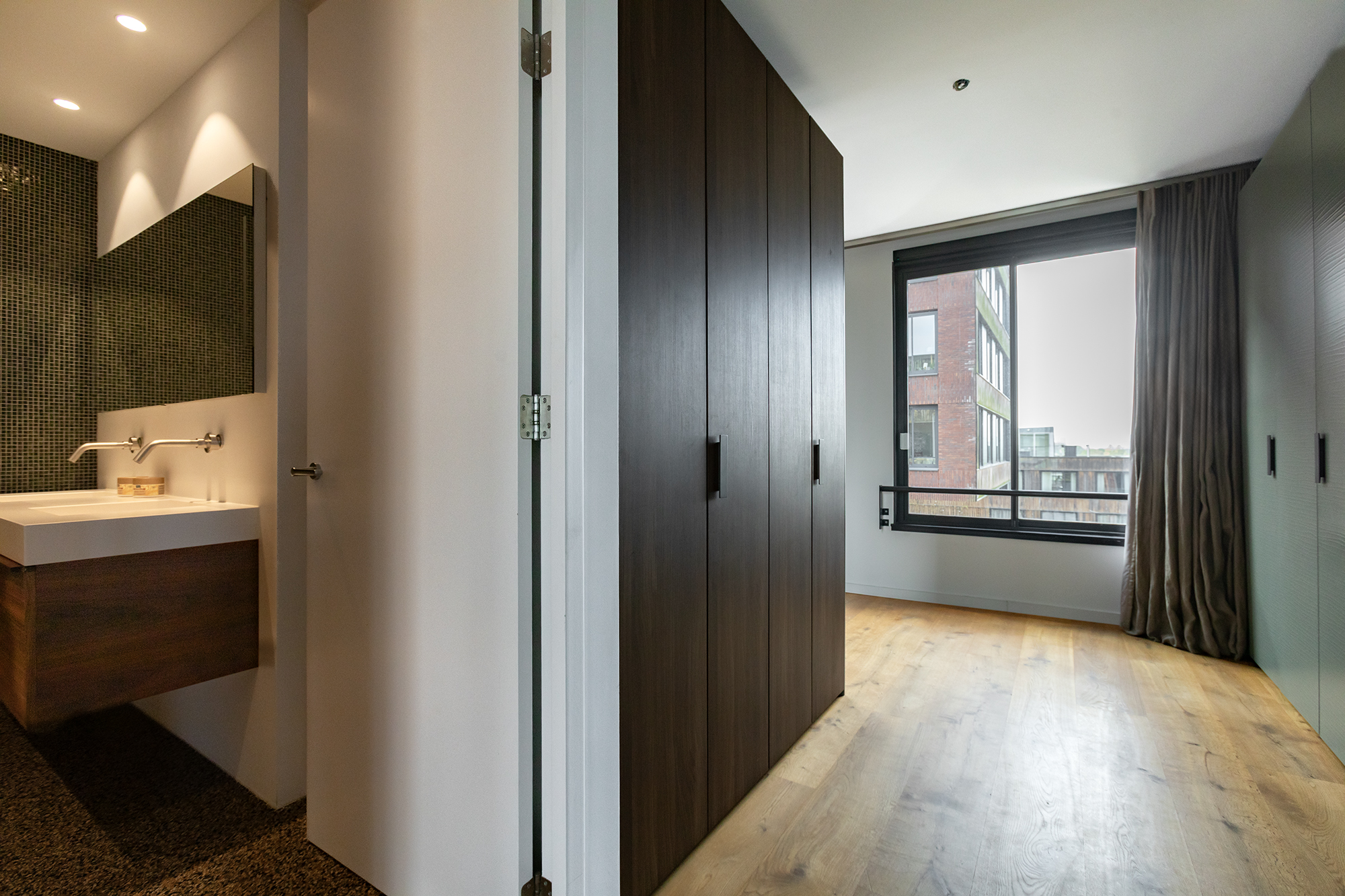 De zeer royale slaapkamer is een oase van rust, met een aangrenzende “walk-in closet” die veel bergruimte biedt én stijl uitstraalt.De badkamer is strak en luxueus: voorzien van een inloopdouche met glazen deur, toilet, modern wastafelmeubel en hoogwaardige CEA-kranen – alles uitgevoerd in een stijlvolle lichte tinten in combinatie met hout.