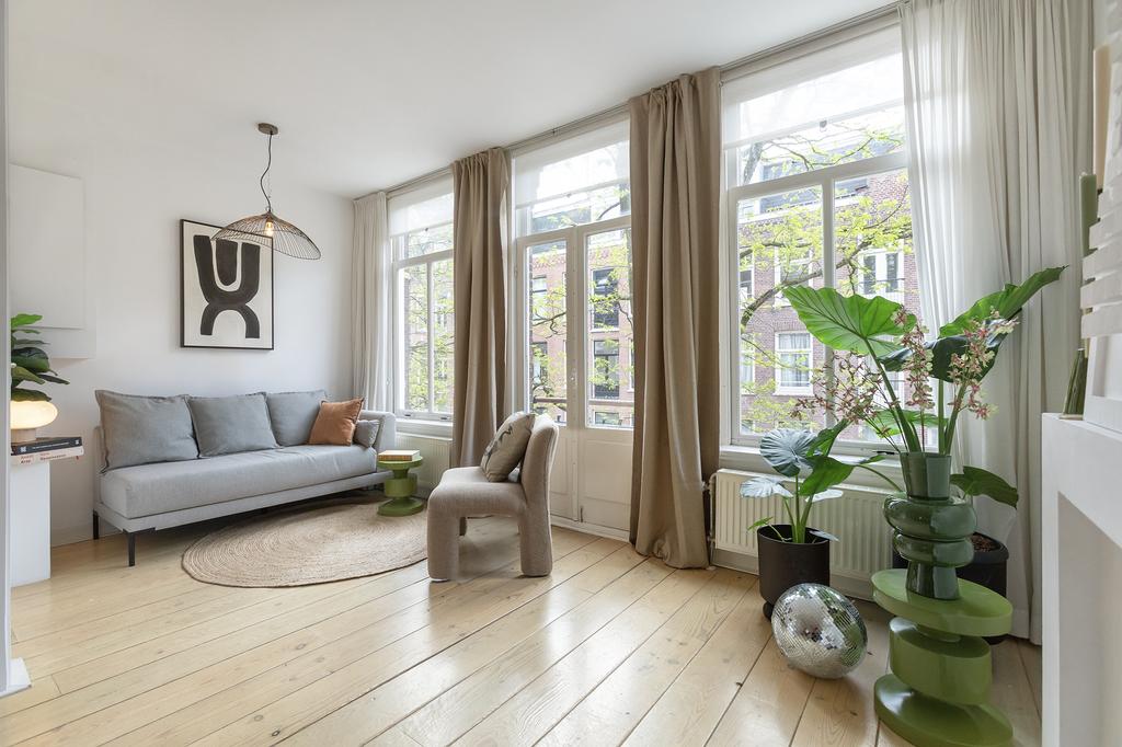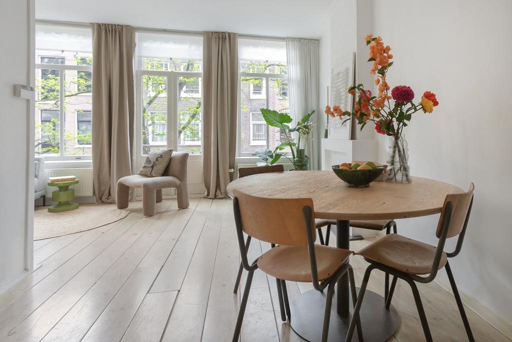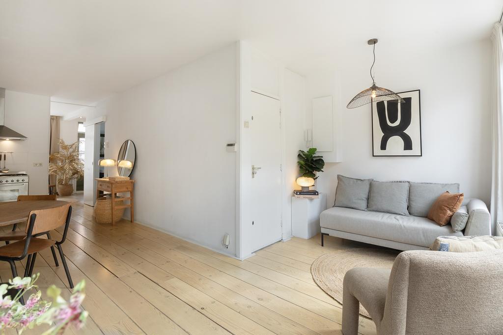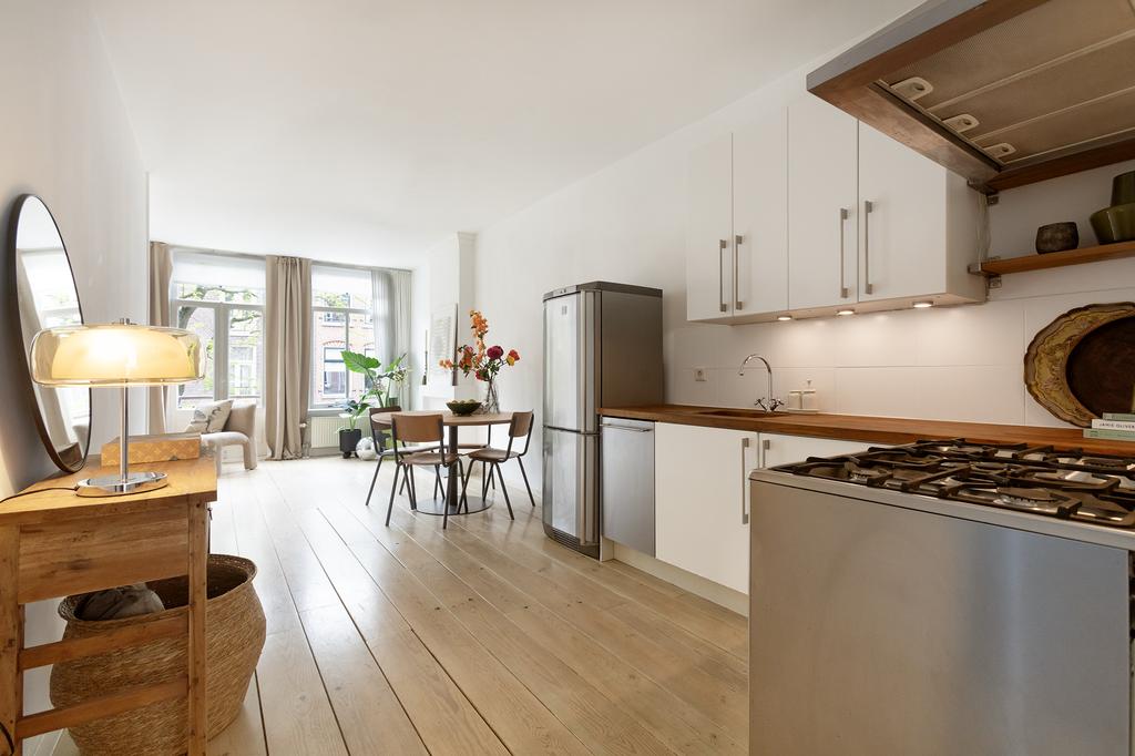 Bij binnenkomst valt meteen het licht op: grote ramen aan de voor- én achterkant laten het daglicht de hele woning binnenstromen. De woonkamer ligt aan de voorzijde van het pand en heeft openslaande deuren naar een Frans balkon op het zuidwesten – een heerlijke plek voor je ochtendkoffie in de zon. Aan de achterkant heb je een tweede set openslaande deuren naar het ruime balkon op het noordwesten, waar je in de middag en avond geniet van het laatste zonlicht. De grenenhouten vloer geeft het appartement warmte en karakter. Het geheel voelt licht, luchtig en rustig aan – precies zoals je wilt wonen in een levendige buurt als deze.