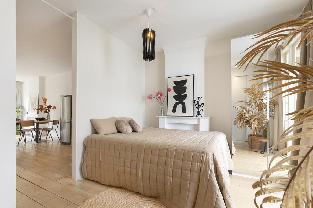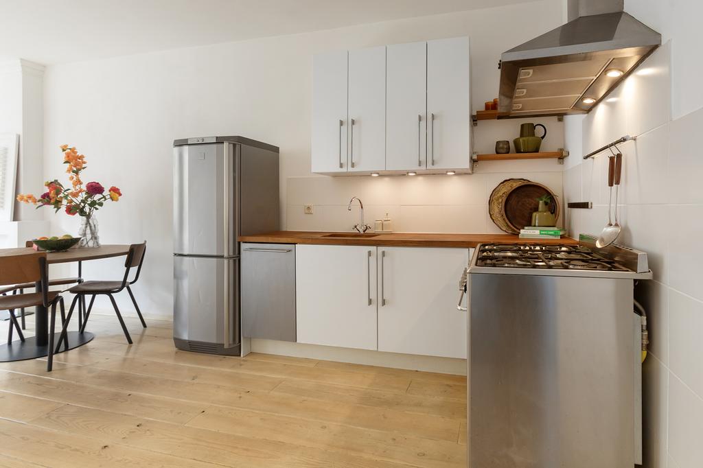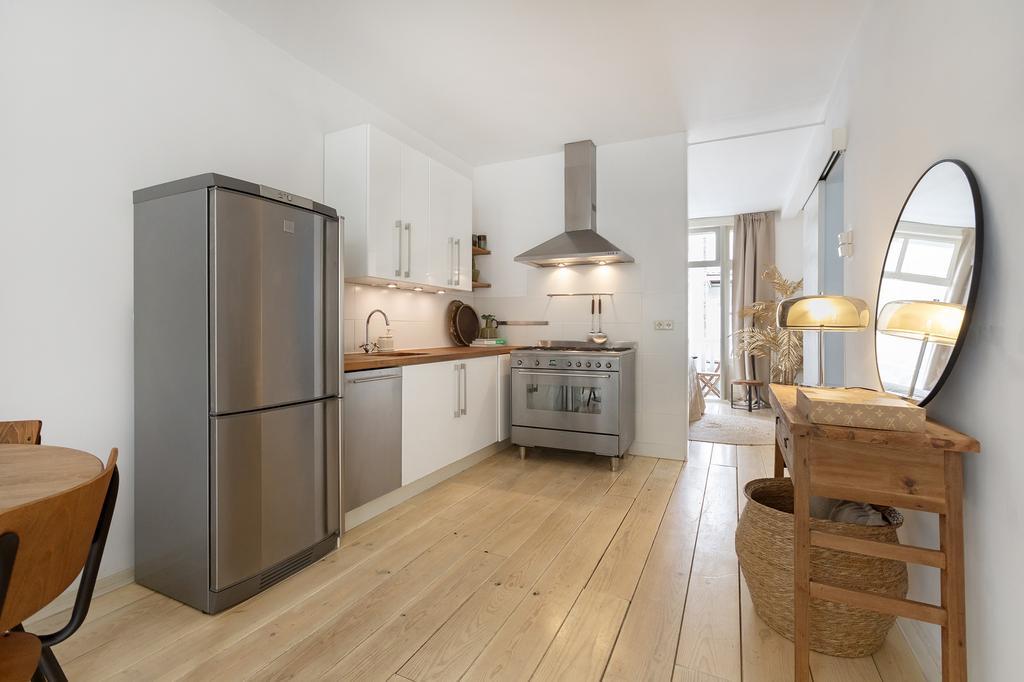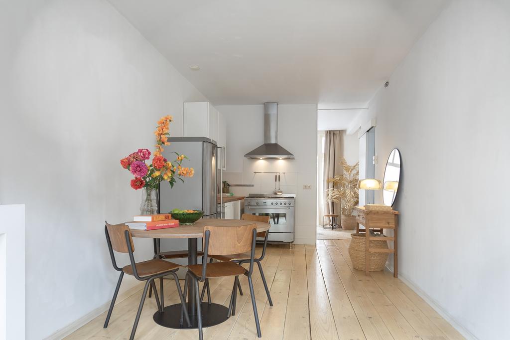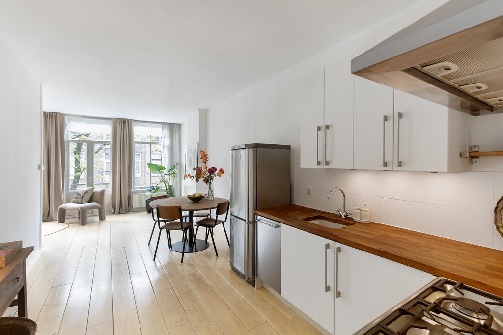 Bij binnenkomst valt meteen het licht op: grote ramen aan de voor- én achterkant laten het daglicht de hele woning binnenstromen. De woonkamer ligt aan de voorzijde van het pand en heeft openslaande deuren naar een Frans balkon op het zuidwesten – een heerlijke plek voor je ochtendkoffie in de zon. Aan de achterkant heb je een tweede set openslaande deuren naar het ruime balkon op het noordwesten, waar je in de middag en avond geniet van het laatste zonlicht. De grenenhouten vloer geeft het appartement warmte en karakter. Het geheel voelt licht, luchtig en rustig aan – precies zoals je wilt wonen in een levendige buurt als deze.