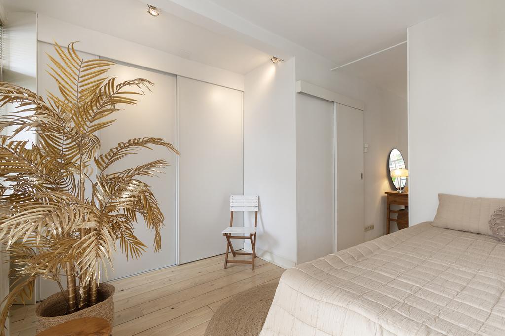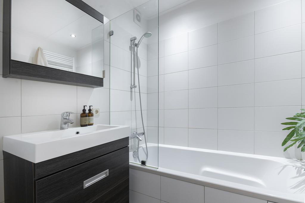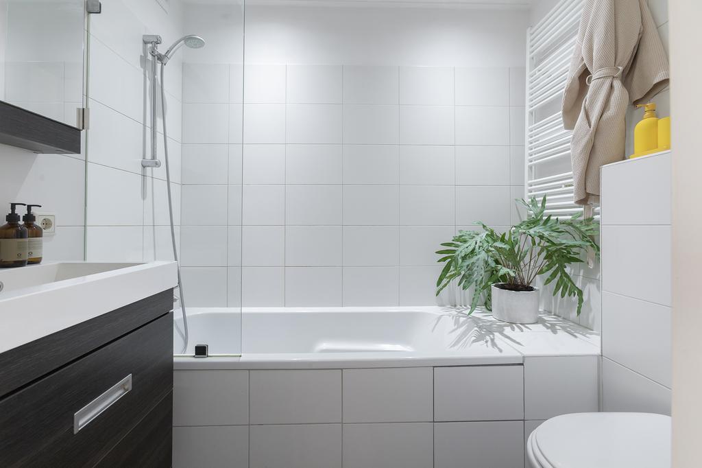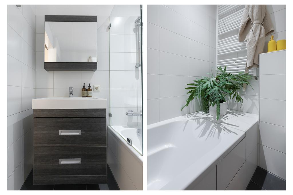 De slaapkamer ligt aan de rustige achterzijde en is opvallend ruim. Dankzij de slimme indeling is er veel ingebouwde kastruimte én genoeg plek voor een bed en eventueel nog een burootje. De frisse badkamer met witte wandtegels en ligbad-douchecombinatie ligt naast de badkamer. Er is ook een toilet en een wastafelmeubel met extra opbergruimte. Alles wordt afgesloten met een schuifdeur: handig én ruimtebesparend.
